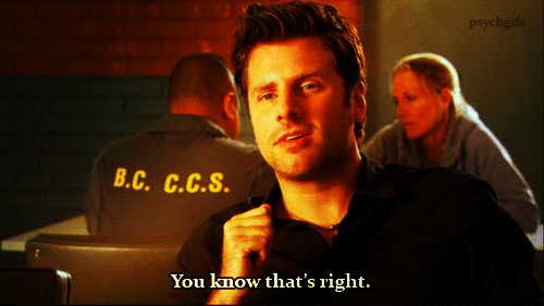 If you’ve seen Psych, yay!!! Good!!! Watch it over and over again!!! If you don’t watch Psych, I recommend you get on that. But in the meantime, here’s a quick synopsis: Shawn Spencer is a twenty-something picking up odd jobs and whiling his way through life in sunny Santa Barbara. His police officer dad turned his childhood into a sort of cadet training, meaning that Shawn is hyper-observant and really good at solving crimes. He puts these skills to work by pretending to be a psychic (hence the title), and solves crimes alongside his best buddy Gus. Also, the theme song is excellent.