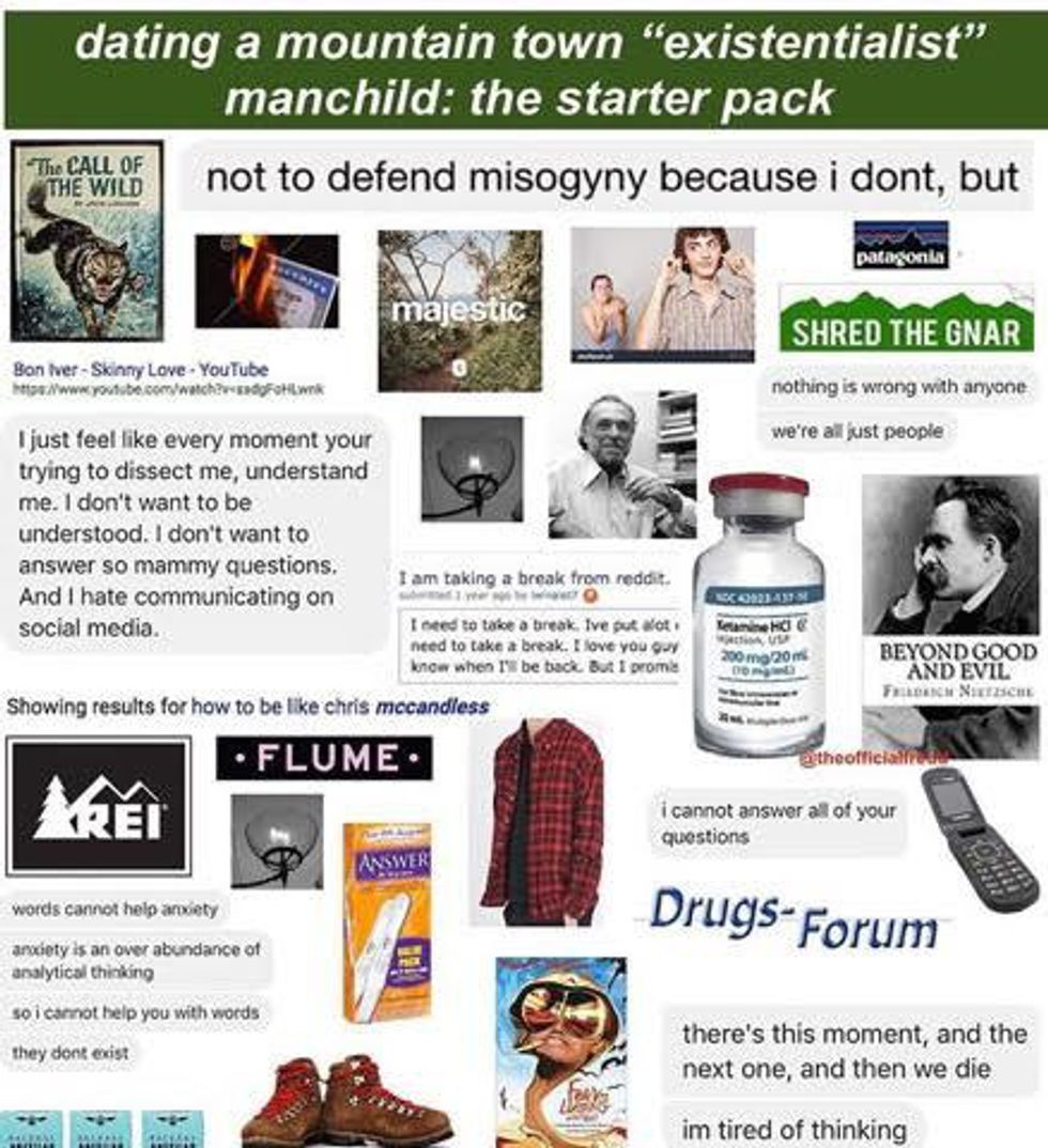 "Starter Pack" memes are an example of a slightly more intricate meme style given the numerous references that are used in a single meme, yet people know exactly what type of person the starter pack meme is referring to and have likely encountered this stereotypical person in their own lives. In this way, the starter pack meme acts as a way to make fun of and draw attention to the frustrating people we often come across in the 21st-century world.