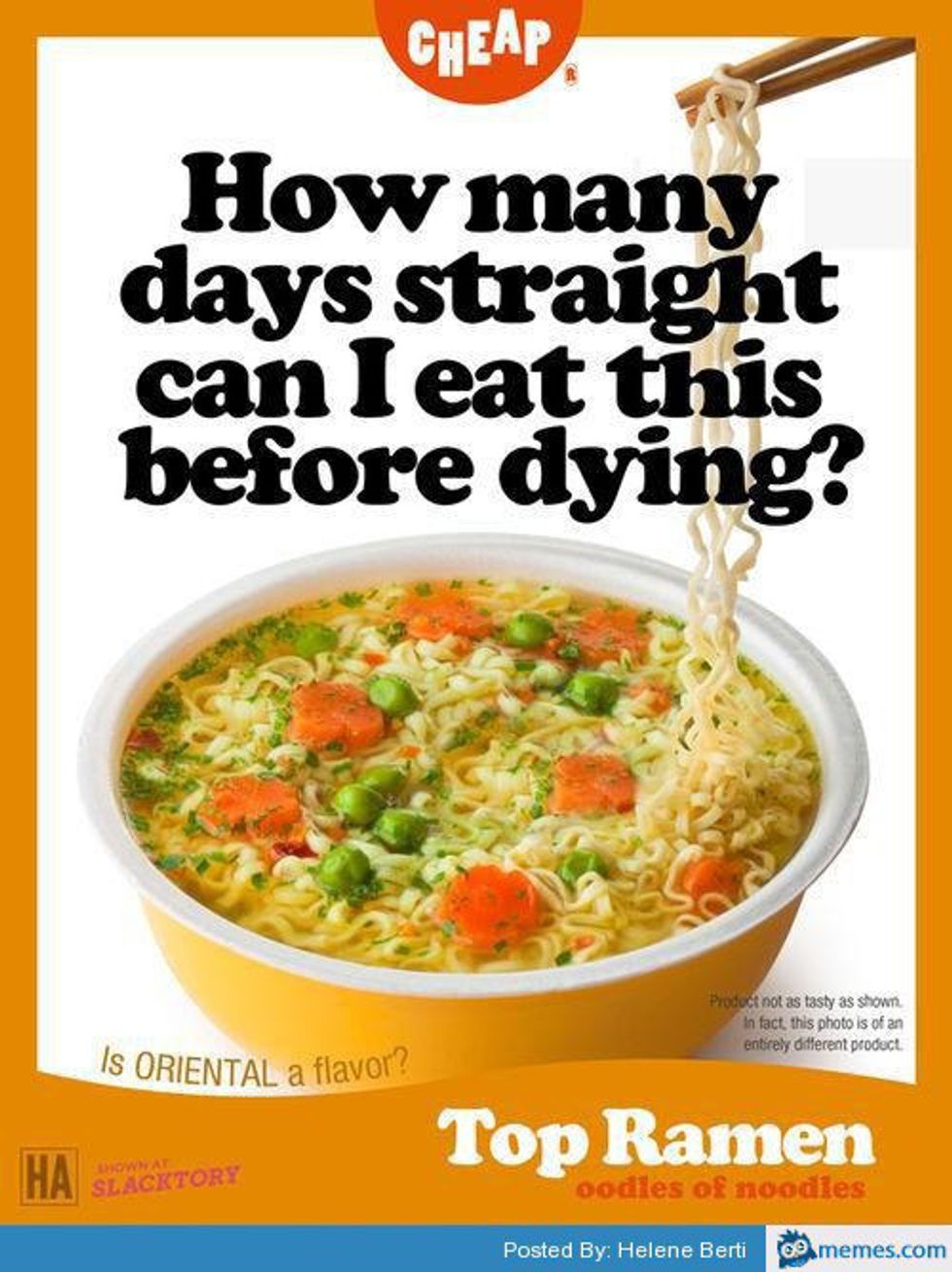 Even though good ol' Sally helps with loans, you have to pay them back at some point. When you are in college and on a budget Ramen comes in. Ramen is always there to help you when you're starving, stress eating, bored, or writing a paper. Yes, I wrote a paper titled Ramen. Yes, I got a good grade on it. Yes, I craving Ramen now.