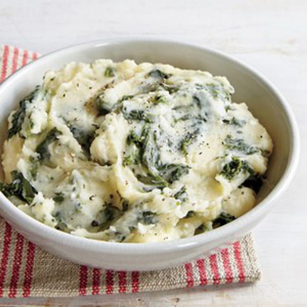 Two pounds of potatoes, three tablespoons of butter, 1/4 teaspoon of garlic powder, 1/2 teaspoon of salt, 1/4 cup of milk, two cups of packed fresh spinach, and two ounces of crumbled feta are needed to make spinach and feta mashed potatoes. First, wash potatoes and place in microwave for five minutes. Next, slice the potatoes into several smaller pieces, and transfer them into a bowl. Add butter, garlic powder, salt and milk. Mash the potatoes until until butter is melted and seasoning is spread out. Then, stir in the spinach leaves. Lastly, crumble feta cheese over the potatoes.