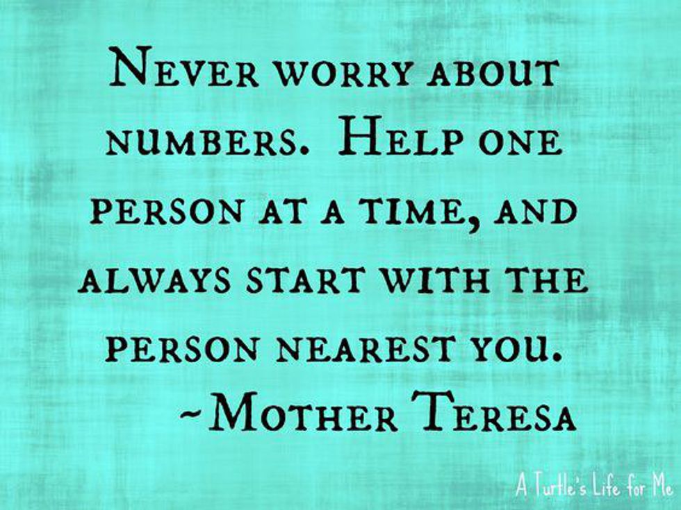 When we hear about the amount of people who need help and love, it can be overwhelming or daunting to us. Reading this quote can keep us in focus when it comes to assisting others. Start small and help out one person at a time. One person's good intentions to others can make a big difference in the long run.