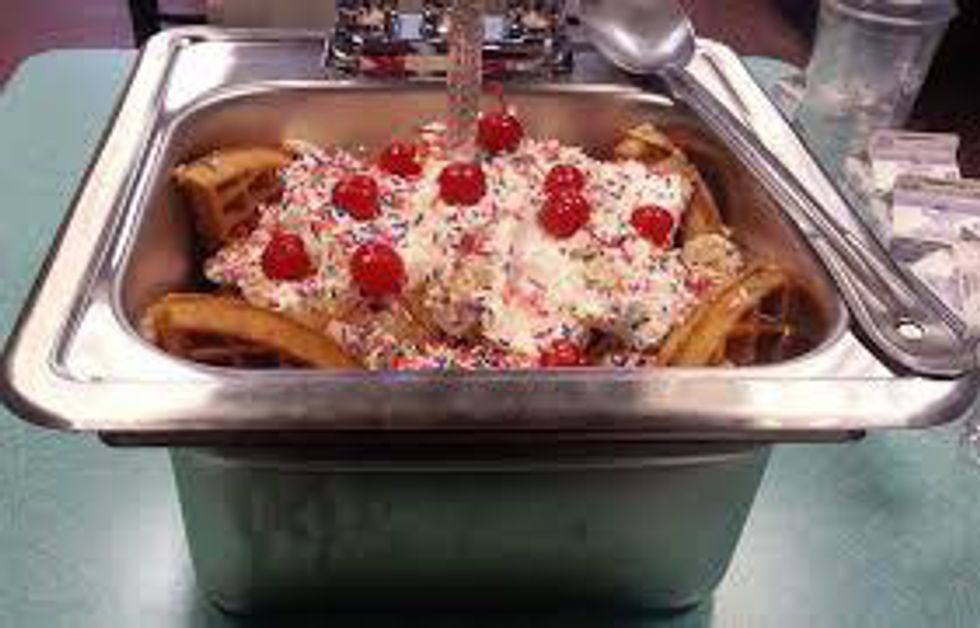 Located on Central Ave in Massapequa, this 1950’s style is best known for its sweet treats such as their homemade ice cream. Whether customers are in the mood to cool off with an old-fashioned dessert item such as an ice cream soda or something more unusual like the Super Sock Hop Sundae, there are more than 30 flavors of ice cream, so there is something for everyone. Home of the kitchen sink, 10 Huge Scoops of Ice Cream, three toppings, two sliced bananas,waffle wedge,whipped cream and much more.
