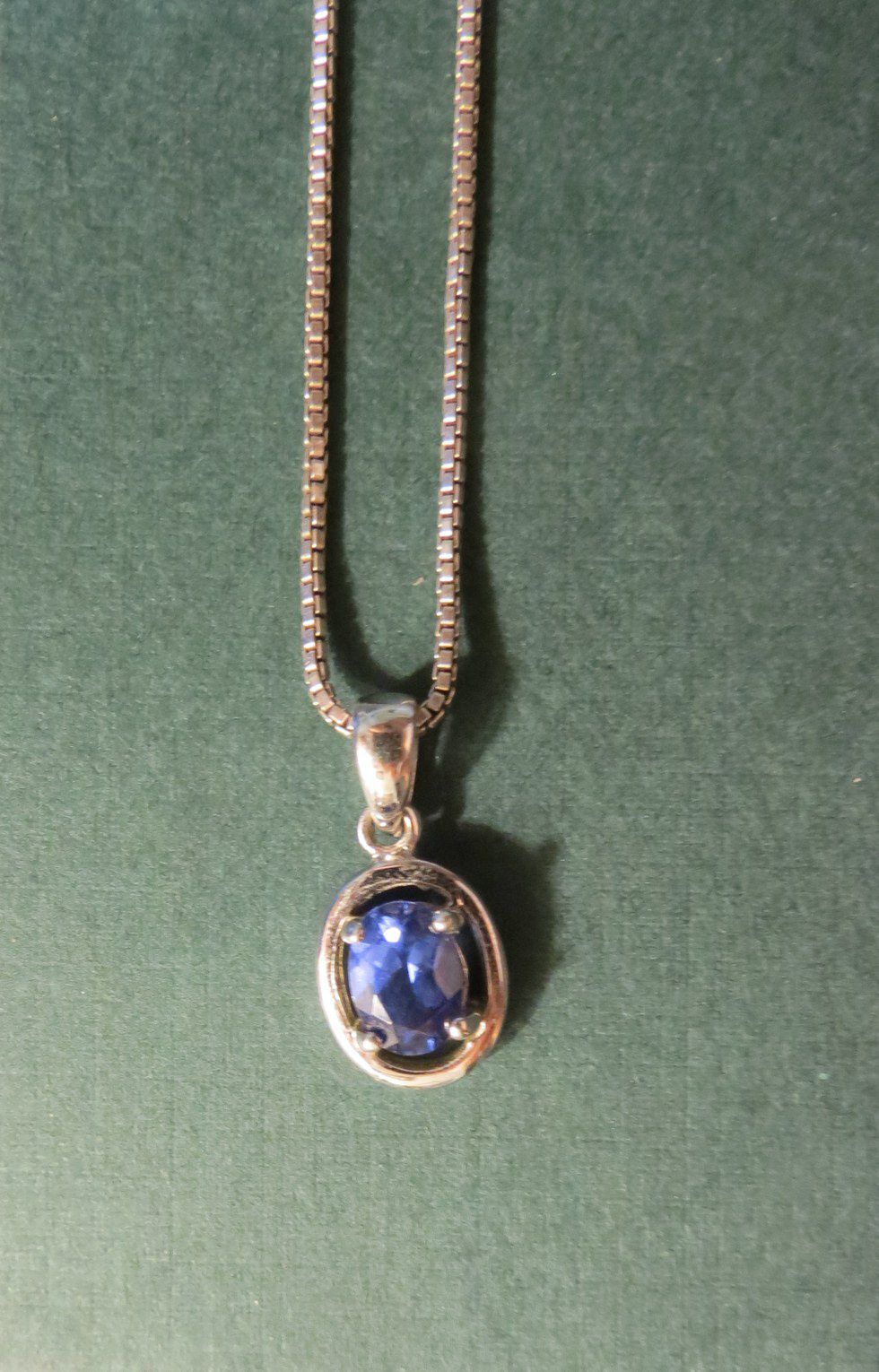 This is a sterling silver necklace, as most of these are, with an oval sapphire, my birthstone. This necklace was given to me for a birthday by my mother in my early teenage years. My mother has a similar necklace, in gold, with an opal (her birthstone) that she received from her mother.