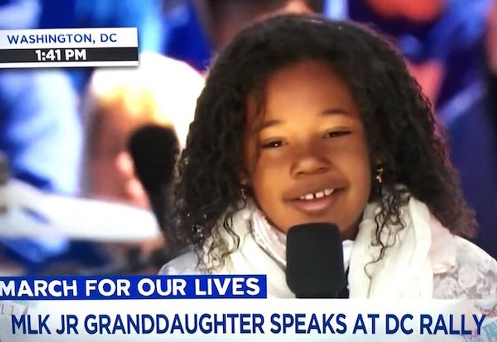 Martin Luther King, Jr.'s granddaughter Yolanda Renee King, at nine years old, gave a speech at the march at the age of nine. In her brief speech, King said that she has a dream to end gun violence the same way that her grandfather had a dream to end racism. King exclaimed that "enough is enough."