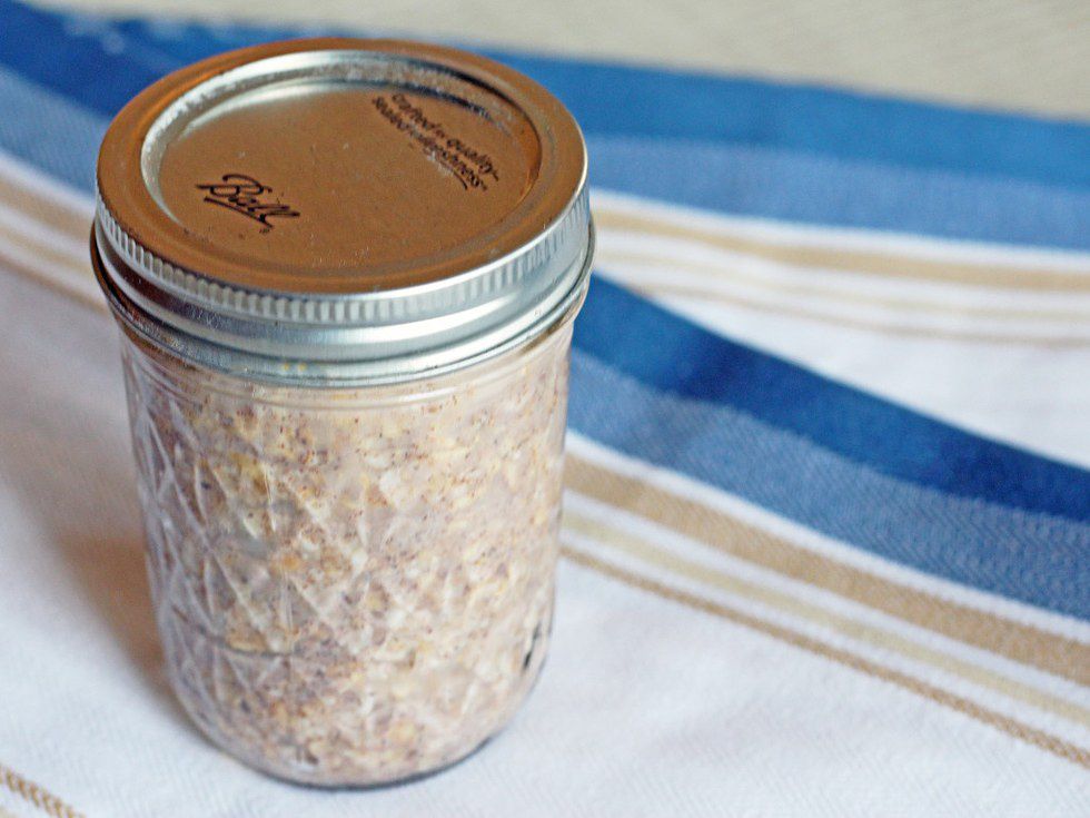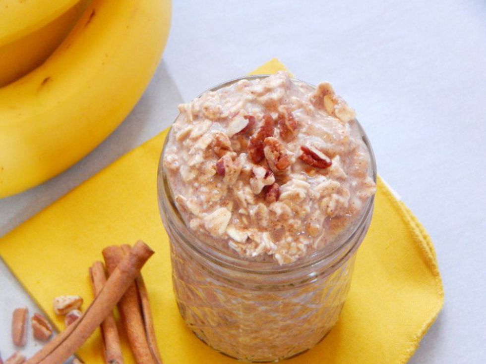 This recipe calls for rolled or steel cut oats, a mashed ripe banana, milk, chopped pecans or walnuts, vanilla extract, cinnamon, sea salt, ground flax and pure maple syrup. Mix all these ingredients together, let them sit overnight and microwave them in the morning and enjoy! Right click on the picture for measurements and directions!