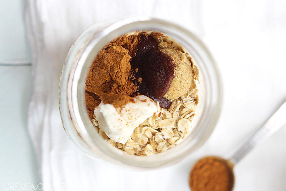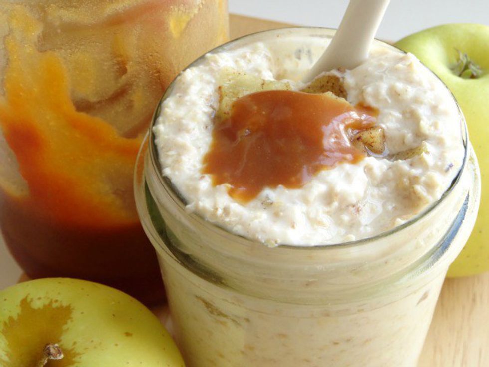 This recipe calls for oats, a small apple, ground cinnamon, brown sugar, natural or greek yogurt, milk and caramel sauce. Mix all these ingredients together, let them sit overnight and microwave them in the morning as dessert for breakfast. Right click on the picture for measurements and directions!