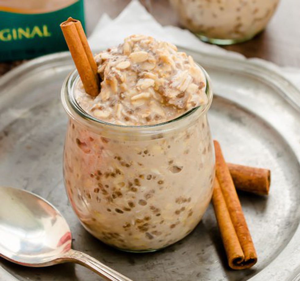 This recipe calls for old-fashioned rolled oats, chia seeds, cinnamon, ground ginger, ground cardamom, ground cloves, brown sugar and almond milk. Mix all these ingredients together, let them sit overnight and microwave them in the morning for an interesting and healthy breakfast. Right click on the picture for measurements and directions!