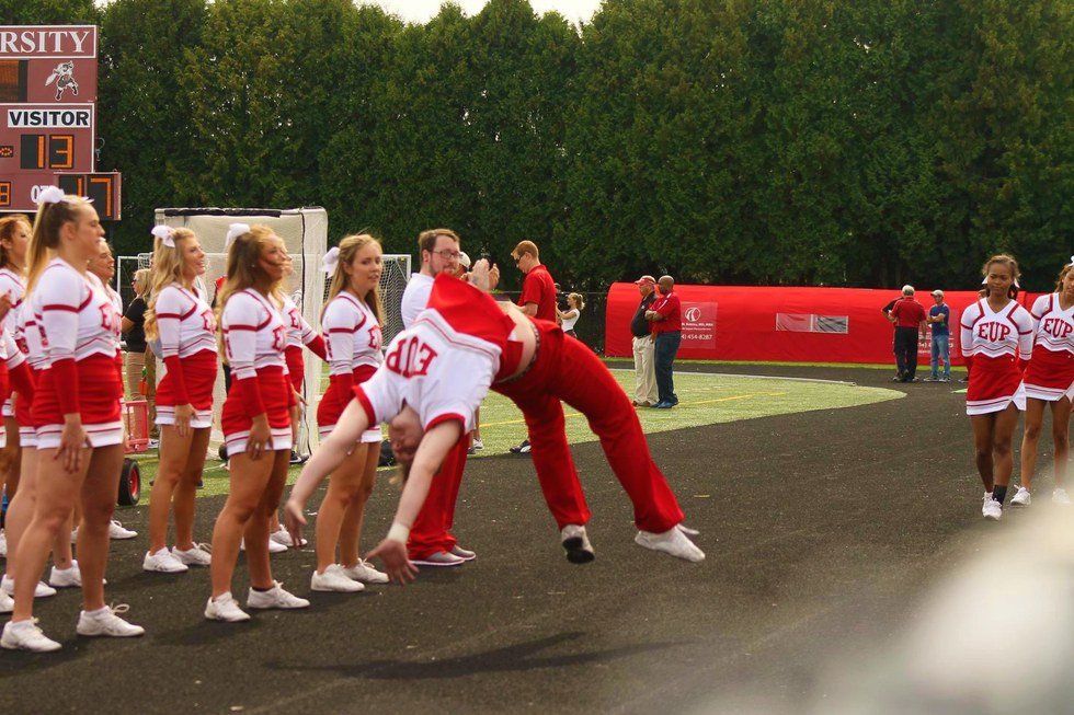 First of all, cheerleading is a sport. Second of all, I’d like to see you try to lift girls above your head, throw them around in the air and set them on the ground safely or even throw your entire body weight around at various different angles to “wow” the crowd.
