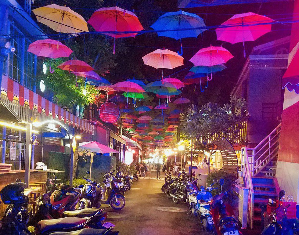 This open-air mall in Chiang Mai is a nice place to relax, eat delicious local Thai food, and shop. The area really comes to life during the evening, as vendors set up booths to sell even more apparel, food, drinks, and other goodies. You can sit down at a restaurant or stop by one of the booths for street food, and there is usually live music at many of the venues along the main walkway. The decor is another reason that I loved this place. As you enter the main walkway, you are sheltered by a stream of vibrantly colored umbrellas that hang above the path.