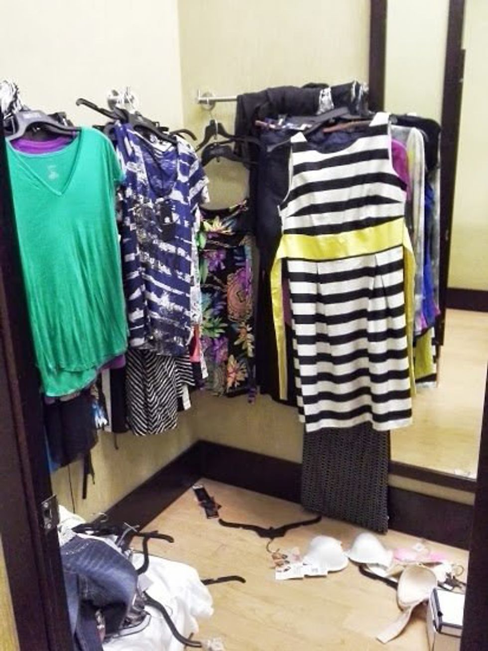 We DON’T get paid enough to do all the extra work you’re causing us when you leave your clothes all over the floor, or bring an outrageous number of items into the fitting room. I’m not saying that you have to put all the clothes you try on back, because that is our job. I’m just saying don’t make our job harder than it has to be. At the least, hang your clothes back on the hanger as you found them, take them out of the fitting room, and hand them to the person working fitting room. Maybe say a quick "thanks" if you're feeling extra generous that day, and they’ll take care of it. Trust me, doing little things helps out so much more than you think they do.