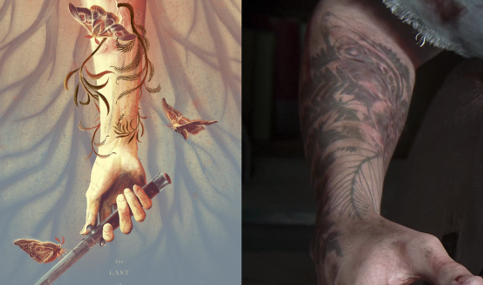 displays a large tattoo on Ellie’s forearm. While the most logical reason for this tattoo would be to cover up her Infected bite mark, there are still multiple questions left unanswered.What made her decide to get a tattoo? Did she design it herself? What made her choose this specific design? What is its significance? Did she give herself the tattoo? Did someone else do it for her (Joel maybe)? How long did it take to finish it? Was she able to keep the tattoo from getting infected (no pun intended)? Will any of these questions be answered in the game?
