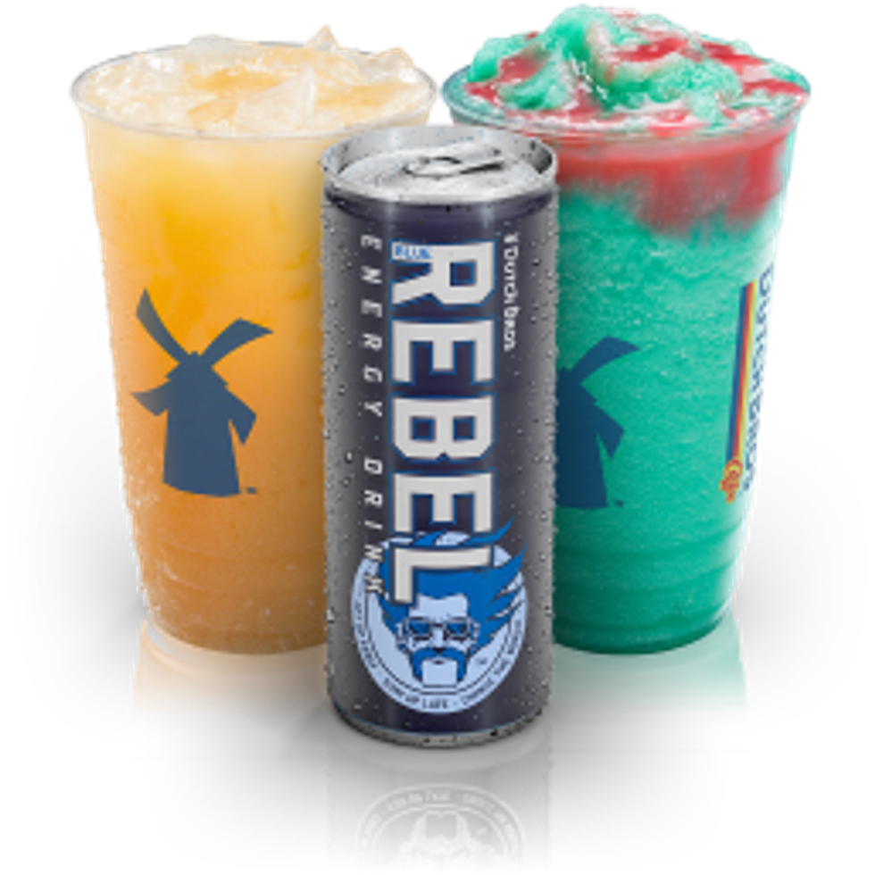 Rebels are energy drinks that you can purchase as an iced drink, blended drink, or in the can. What does Starbucks have? Refreshers. From Dutch Bros, in a 12 oz Blue Rebel Energy Drink, there is approximately 114 mg of caffeine. From Starbucks, in a 12 oz Strawberry Acai Refresher, there is approximately 45 mg of caffeine. Case closed. If you're in need of energy, definitely go to Dutch.