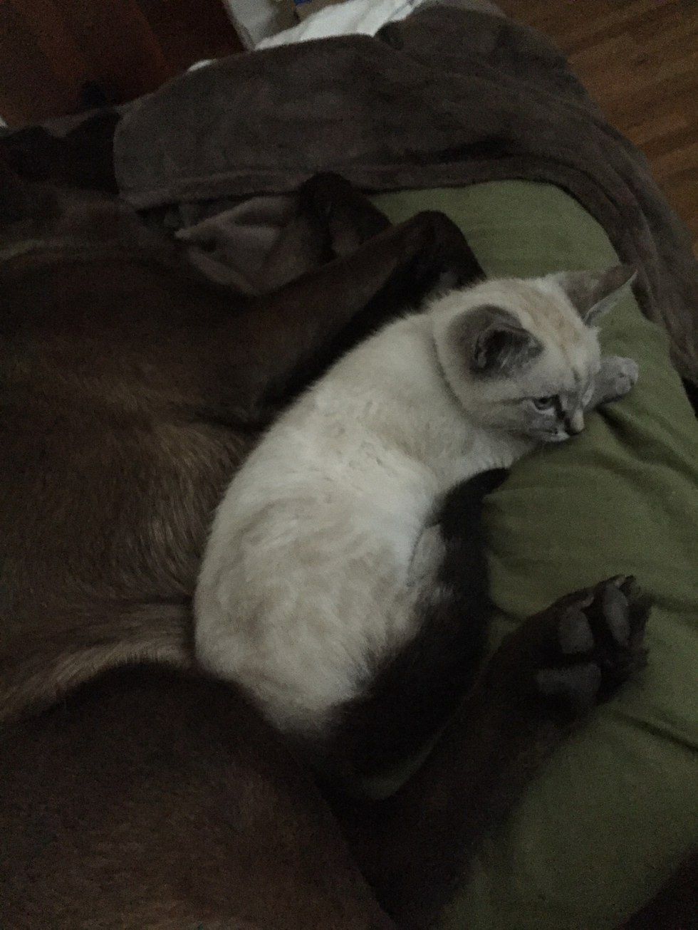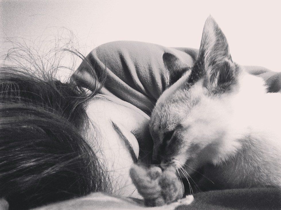 I constantly have something to do now. Whether it's taking care of her needs, cuddling her, playing fetch, watching her be a cat, watching her try to be a dog, watching her catch moths, and then get grossed out by the taste. She has my full attention when we hang out, and when I care for her. I know that for me with my depression, having someone or something that is relying on me, makes it a little easier to wake up and actually take care of responsibilities and life.