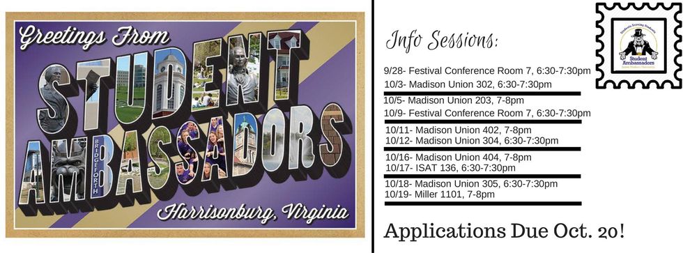 Even if only one of these points peaked your interest to apply SA, don't hesitate!! You won't regret taking the risk of becoming an Ambassador! Also, if you want some more reasons before you officially make your decision to submit your application, check out Colleen Coleman's (another absolutely lovely Ambassador and Odyssey Creator) article, "5 Reasons You, Yes YOU, Should Be A JMU Student Ambassador."