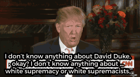 The Donald is very understanding of all people, including David Duke: the Grand Wizard of the Ku Klux Klan. Trump didn't disavow Duke's endorsement nor white supremacist support on the principle that he didn't know them. I try not judge members of the KKK either, I'm sure under those white robes they're nice people!