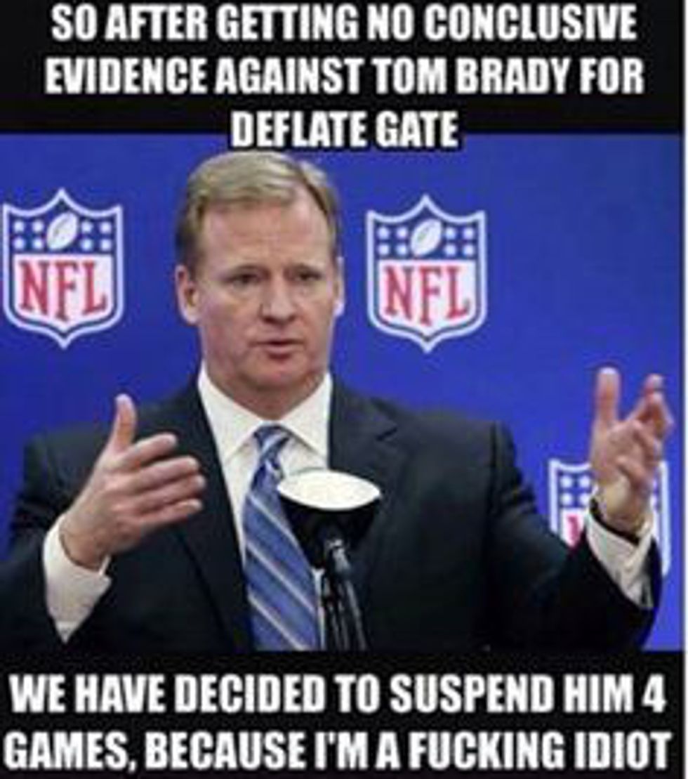 I know that Belichick is probably one of the chattiest coaches in the NFL, filled with wit about "Instaface", and his famous long post-game speeches. After the deflate gate news broke, he made it very clear in 20 words or less that he had nothing to do with, and didn't know anything about the balls being deflated. He even devoted a whole press conference to talking about PSI's and how footballs are made. He talked about the extensive tests he put his QB through to see if he could tell the difference between different pressures in the ball. Bill even cracked a joke about this whole process and how ridiculous it all was, which was basically what we were all thinking.4. Roger Goodell pushed very hard for the four game suspension