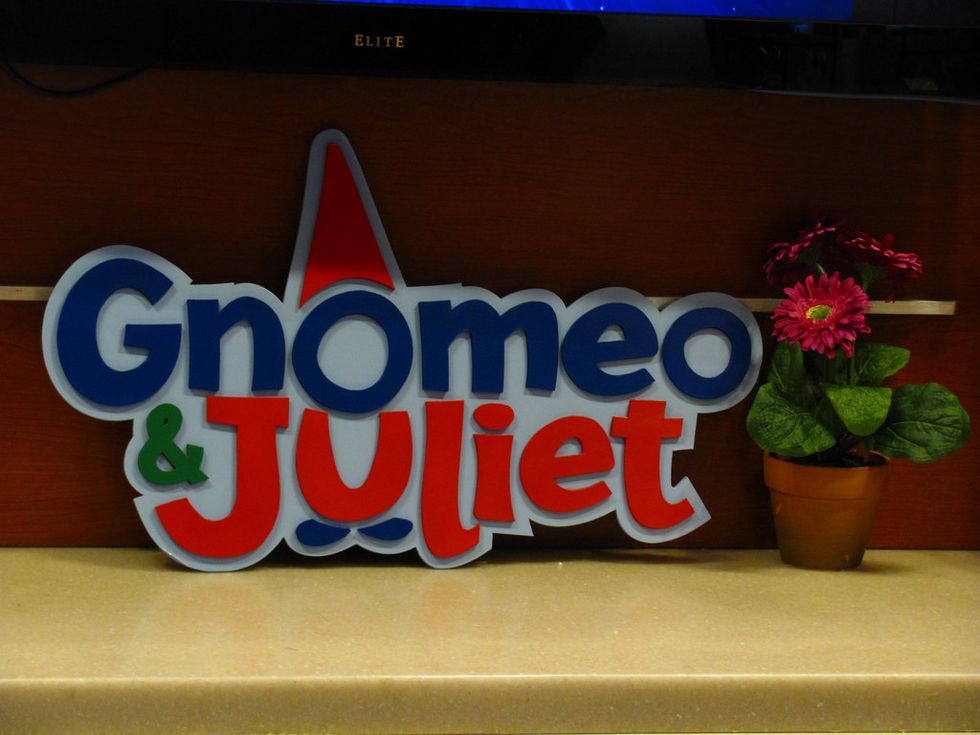 Perhaps best of all, similar to Pixar movies sneaking in Easter eggs from movie to movie, if you pay attention, you can see references to Shakespeare's other plays. Gnomeo is nearly killed by a truck called Tempest Teapots (*wink*), and during the Friar's (a pink flamingo, in this case) flashback, a movie ticket is seen with the show "Much Ado About Nothing" playing (*double wink*)