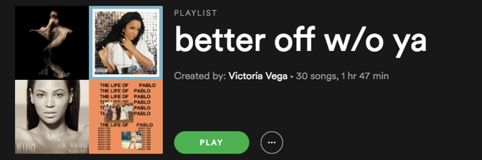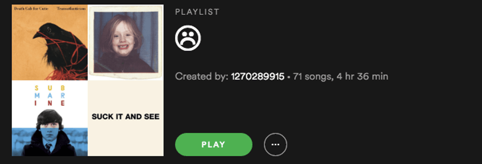 The type all depends on you. Feel like wallowing in self-pity and listening to sad music? Go for it. Want to feel happy and listen to upbeat tunes? You can do that too. Spotify has endless playlist options to fit whatever mood you're in or what genre you prefer, so take this time to discover new songs and artists. Don't feel bad if you just want to feel sorry for yourself for a while. After all, it's your party and you'll cry if you want to. Just don't let the pity party last too long. Here are a couple of examples of playlists I created for several moods.