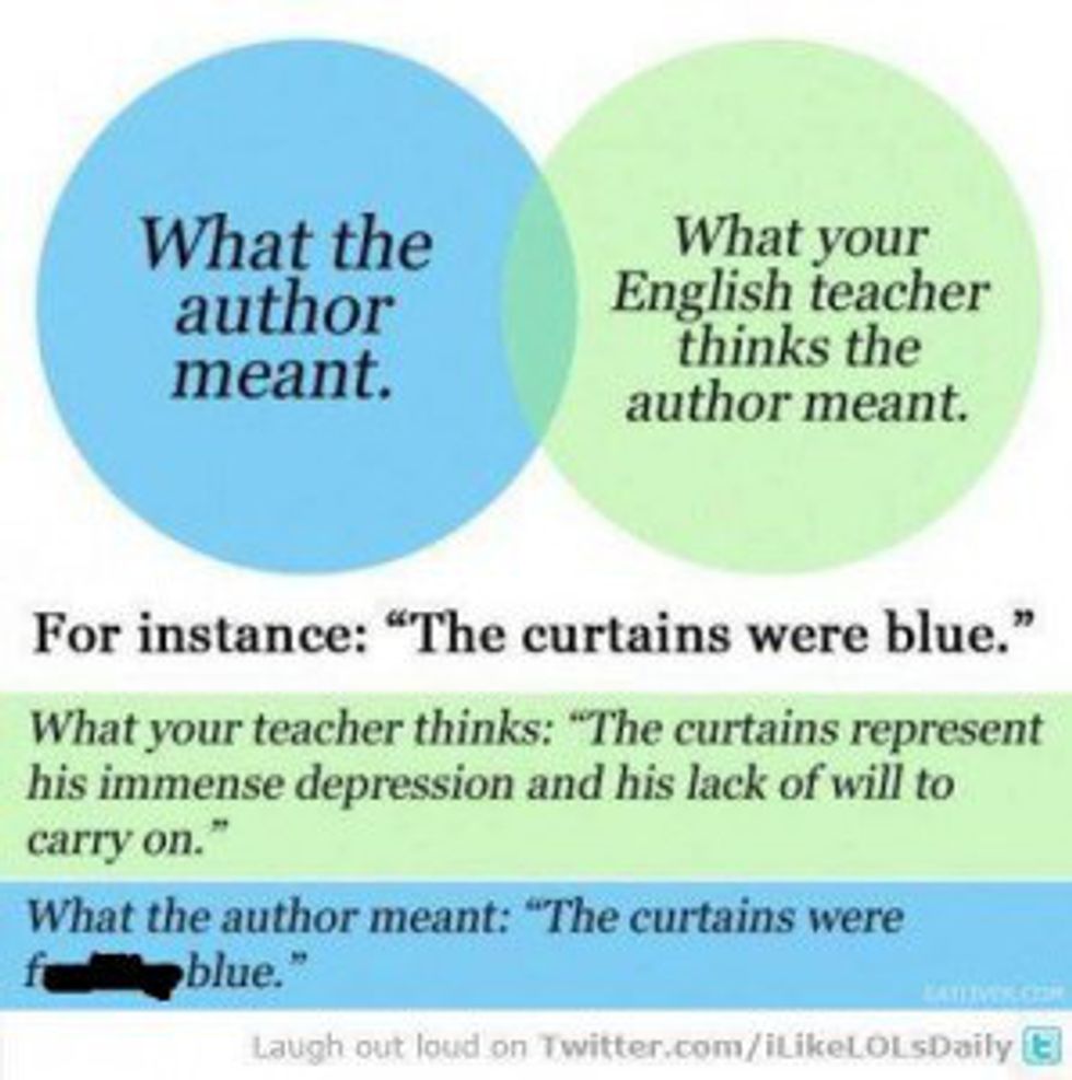 A lot of time in high school English, students spend time trying to closely analyze the text for its "deeper meaning." Colors were symbolic, character tones revealed more about their past than what the character explicitly said, every word and action was deliberate. Our teachers taught us to look for the deeper meaning in the texts. I swear I spent a week in class discussing how the green light in "The Great Gatsby" represented Gatsby's hopes and dreams for the future; his American Dream. We sure beat that topic to death but I am sure some students were quietly thinking, "No. It's just the color of the light." As English majors, we do look for the meaning behind things but we are well aware that not everything has this "deeper meaning." I am not more inclined to over-analyze events. When I see my friend wearing a purple shirt, I don't think, "They must have been feeling sad today because purple is her grandmother's favorite color and her grandmother happened to pass away."