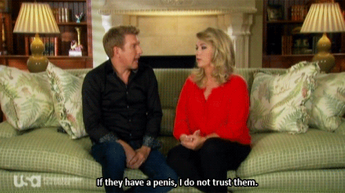 He lets you know that he's the center of conversation. As the man of the house, he's calling the shots on furniture, design, fashion, dinner, and even the niche things like pets (example: Savannah's dog fiasco). Todd Chrisley's way or the highway, but don't pretend like he's the only diva. Another speciality of Todd Chrisley that we know well.
