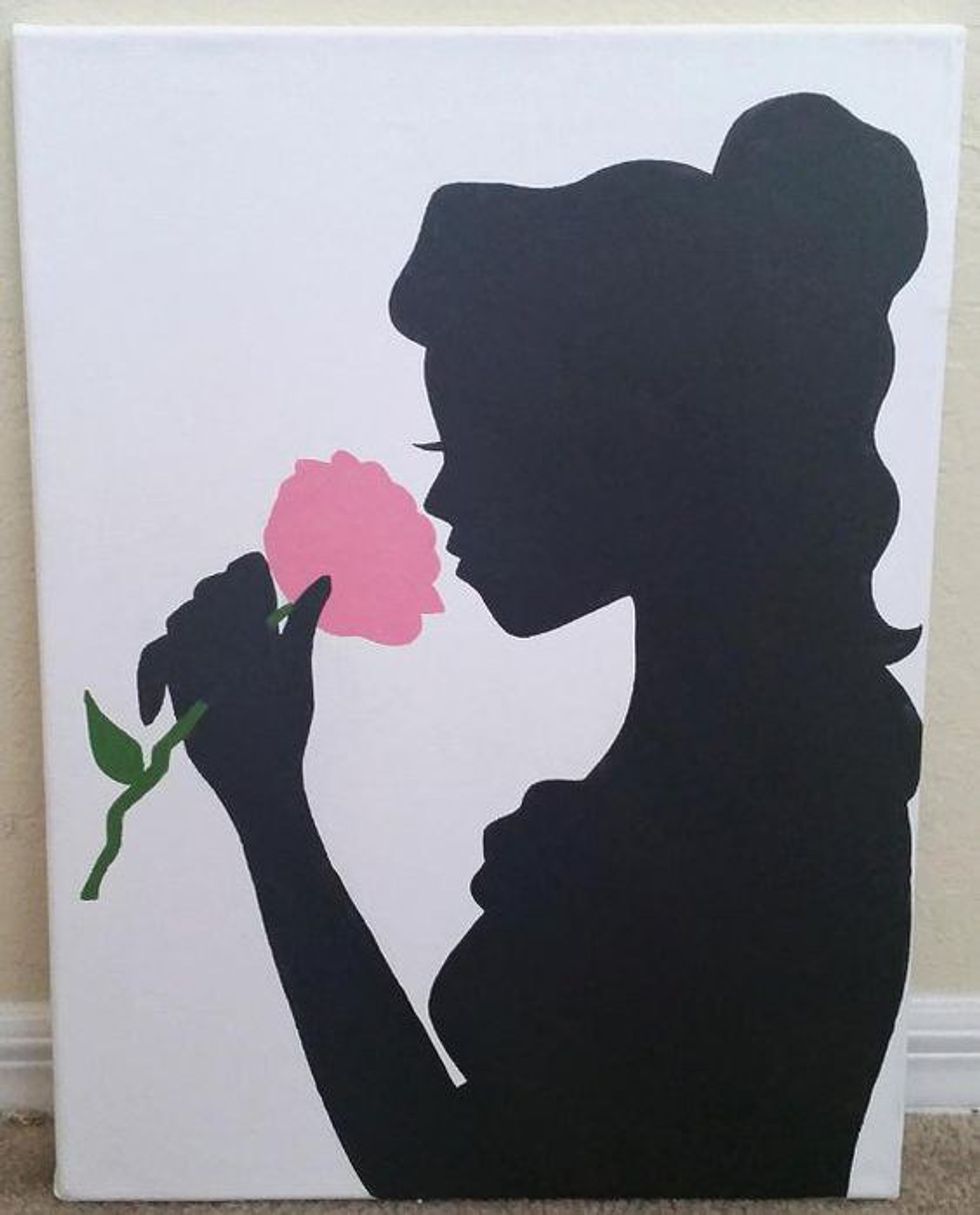 Not only are these super simple, but they look so fantastic. I made this one of Belle for my roommate, except with a red rose because everyone knows the rose in the movie is red, thank you. With many silhouette paintings, you can find a picture of your favorite character, print it out, trace it onto a canvas, and then paint away! Super simple.