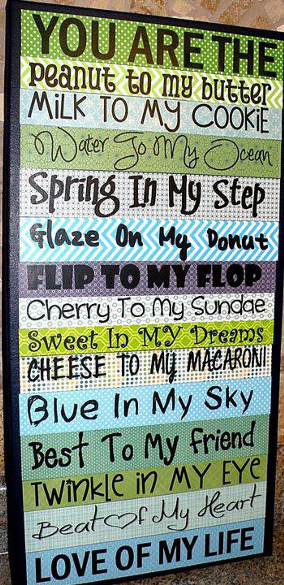 Okay, so this is probably the best gift I have ever made for my S.O. You need a canvas, preferably one that is raised (so, not the super cheap ones that are just flat), some scrapbooking paper, Modge Podge (or the off-brand because it works just the same), and a sharpie. Cut strips of scrapbooking paper and lay them on the canvas covered in the Modge Podge. After it has dried, grab a sharpie and write down these cute little sayings. Let the sharpie dry for a little, then cover the entire thing in Modge Podge to seal it all in. Tada! Super cute, super easy gift that is sure to make your loved one happy.
