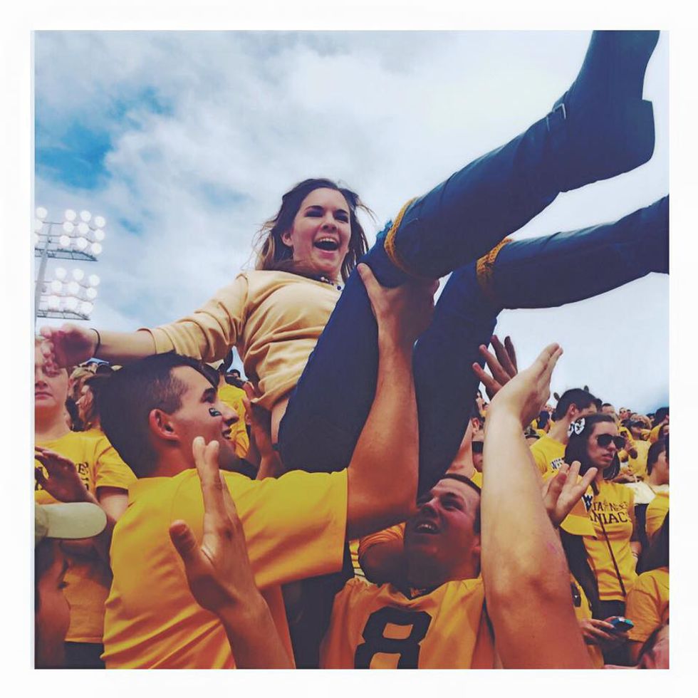 My first WVU football game, I got really nervous when I saw boys throwing girls into the air multiple times in a row, and to be completely honest, who wouldn’t be a little nervous about that? However, getting tossed in the air is one of the exciting parts of the game! Girls get tossed into the air following each touchdown, up to the amount of points that we currently have on the board. So you could be getting tossed multiple, and I mean multiple, times in a row. It’s exciting getting tossed in the air and feeling weightless up above the student section (even if it’s only for a second). The first time I got tossed, I had the biggest smile on my face and it just made the game day experience all the better for me.