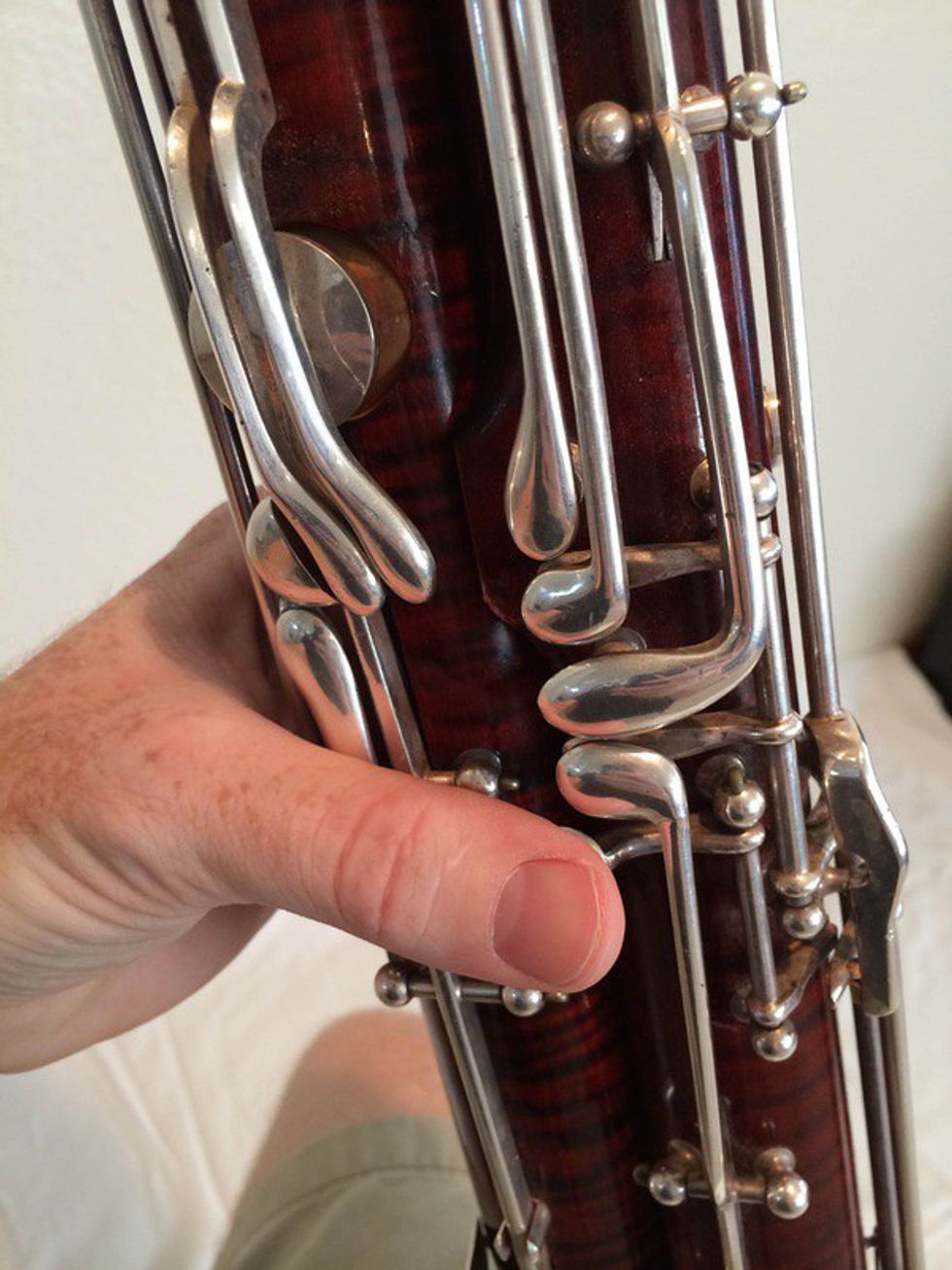 The whisper key, the key that the model above is pressing down, is a very important key on the bassoon. It helps anchor notes to the appropriate register, and can offer helpful suggestions for trill fingerings. All bassoon players remember the first time they pressed it down. Most remember holding their ear to the bell of their bassoon to hear the whisper key offer soft advice on how to get from that b flat to a flat with ease! Some advanced bassoons will even advise you on how to stagger the breathing in a group!