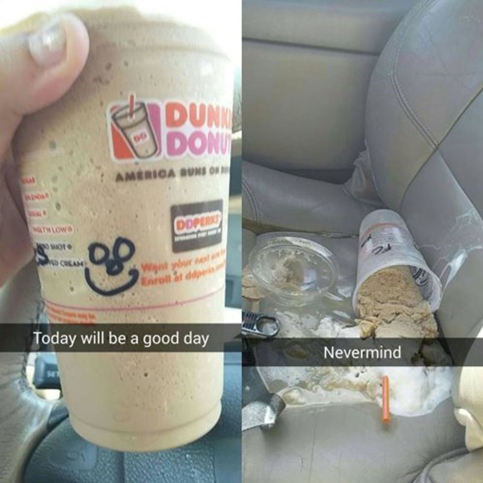 It's always something hot, cold, you name it. One time I was at Dunkin Donuts, and I got an iced coffee. I then knocked it over once I was leaving the store. After I got ANOTHER cup of coffee, I then proceeded to drop in the parking lot 10 minutes later. Yeah, I'm surprised that they let me back into Dunkin Donuts also.