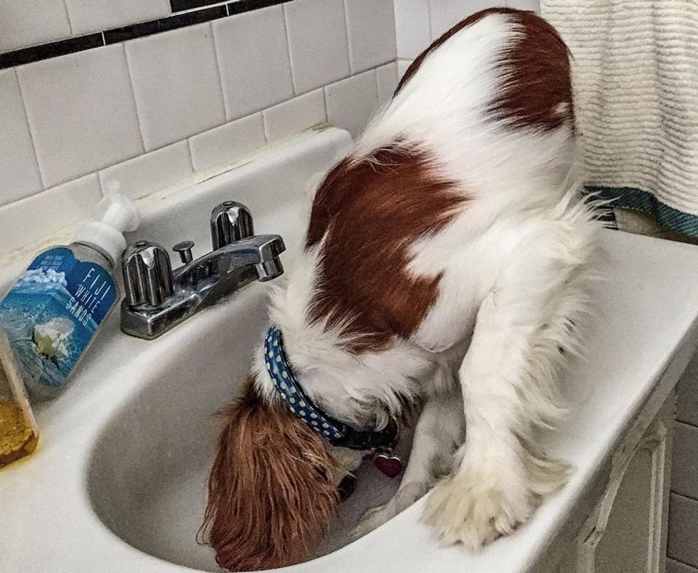 Curious Katy often explores laundry baskets, window sills, and even the bathroom sink.