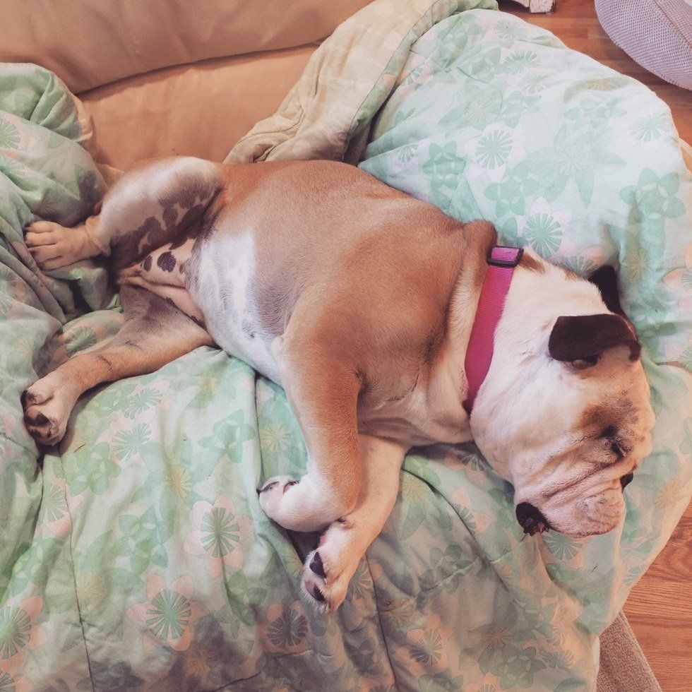Mabel likes to take at least two naps a day. Bulldogs get tired very easily from simple tasks such as eating and walking around for a little bit. Giving Bulldogs a nice, comfy bed to take countless naps in is essential to them being happy.