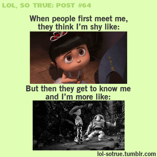 I'm so weird it's crazy to think that not everyone knows that. When I'm with my best friend, we get weird looks and I don't care because I'm me enjoying life. But when meeting people or hanging out with people you don't know very well, well, we tend to hide in our shells.