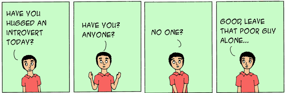 Personal space IS a thing. If we don't respond, we don't hate you, we might just feel extremely uncomfortable because you're invading our invisible little bubble. We'll let you know when we're ready, just know introverts can be uncomfortable creatures. Physical touch is not always everyone's love language, and introverts, usually so.