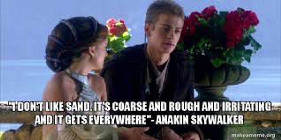 Okay so I kind of have mixed feelings about this one because I grew up going on vacation to the beach every summer. However as much as I love the beach I do not enjoy the walk through the sand to get to our spot of paradise day after day even though I am more then willing to do it. Anakin is right it's corse and it gets everywhere so as far as I am concerned he is completely justified. attempting to walk across sand while using a walker is never fun and the sand itself also ruins the walker itself, so sand nine times out of ten can kiss my a** even if it provides a great workout.