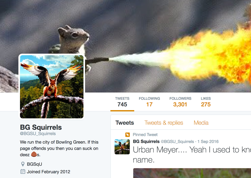 They’re crazy, they’re anonymous, they’re SICSIC. Keep up with their shenanigans and keep your eyes peeled for some free Laffy Taffy if you ever see them.4. @BGSU_Squirrels