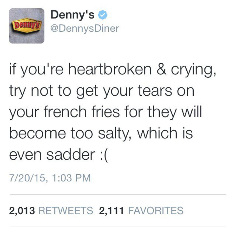 I know this seems random that Denny's verified account would be worth following, but trust me it's one of the best and not annoyingly promotional. They post random yet hilarious things about loving food that would be funny from any account but somehow being from Denny's makes it even funnier.