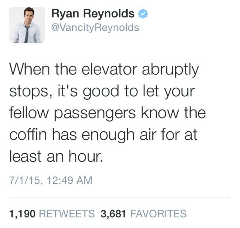 Ryan Reynolds doesn't seem like he would have a very exciting twitter, but this account is so funny that I wouldn't doubt that he hired a comedian to write his tweets. Whether or not he is actually the one tweeting, this account is definitely worth a follow.