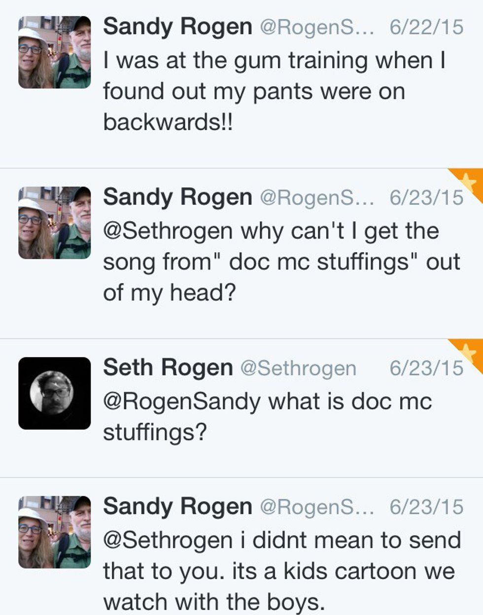 Yes I know what you are thinking, why would you ever even think to follow Seth Rogen's mom on twitter? Well I'm not sure how I found this lovely gem, but Sandy Rogen is the best thing to ever happen to my twitter feed. She is the perfect amount of adorable motherly presence that everyone needs in their life and basically you get to watch her do all the funny mom-ish things without the nagging.
