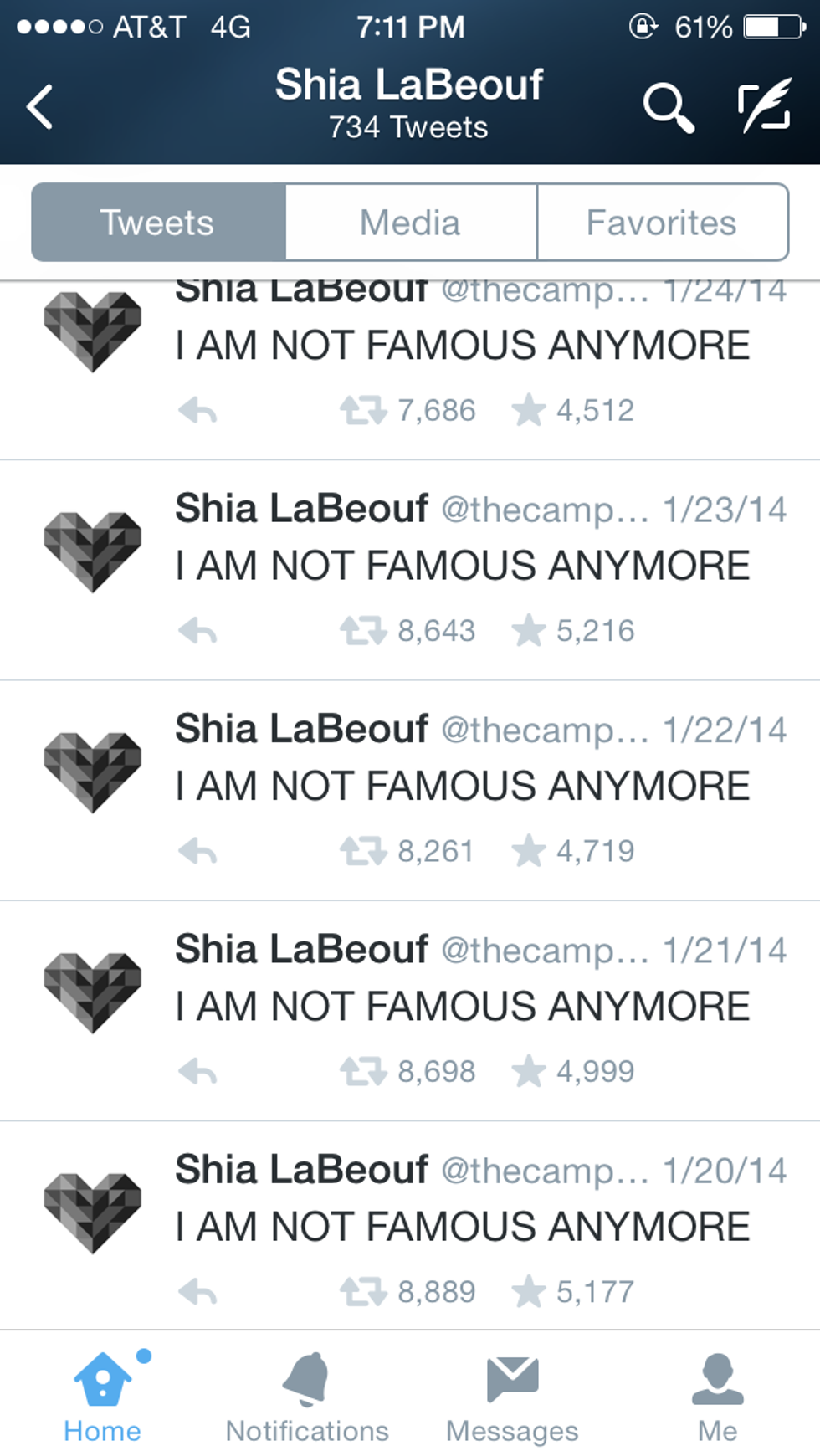 Shia LaBeouf is one of those celebrities that you have to follow because you never know what they are going to do next. He is hilarious and has been known to live tweet his acid trips, which is always an interesting turn out. Also he once tweeted "I AM NOT FAMOUS ANYMORE" every day for about a month.
