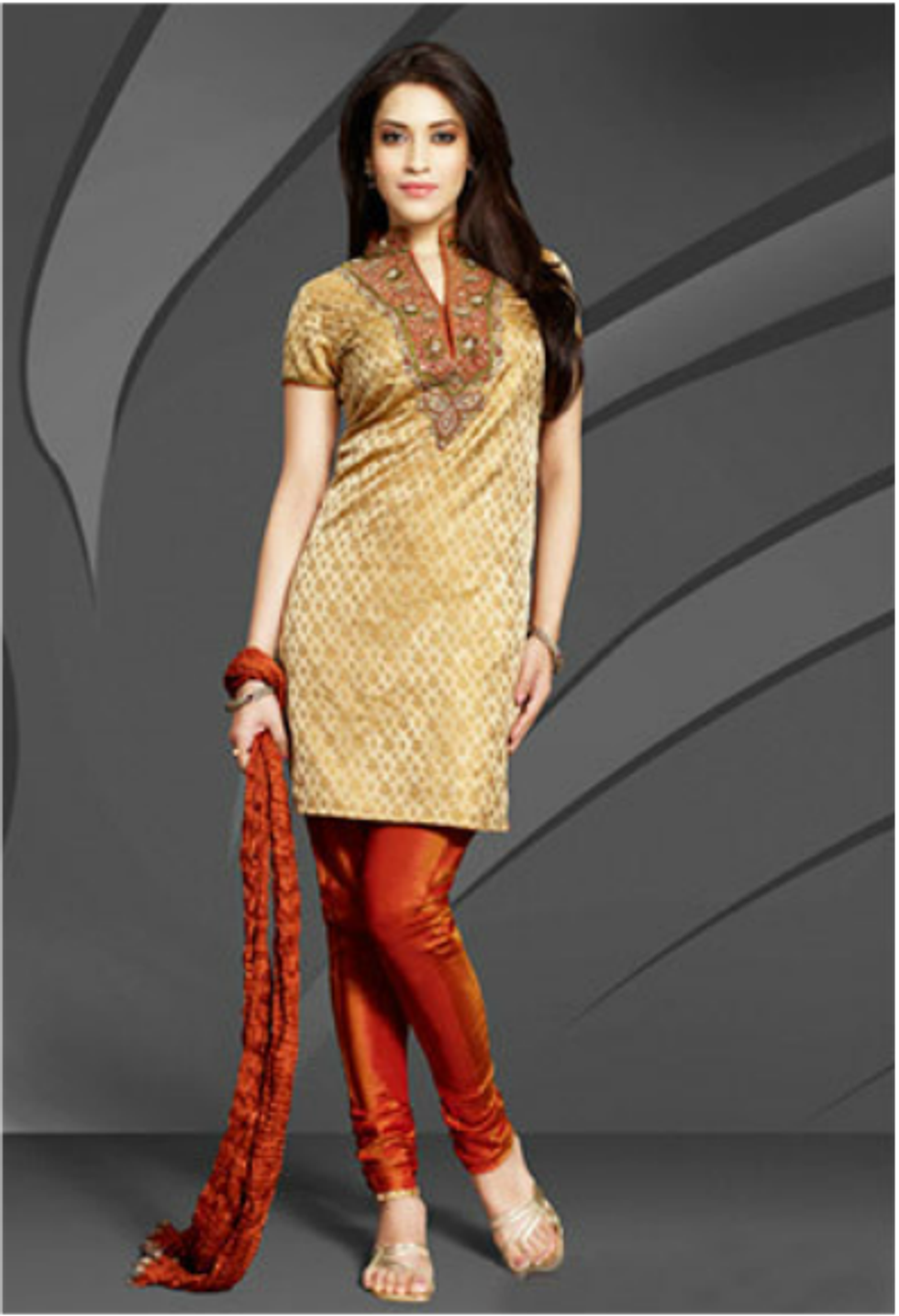 Churidars are a type of pant which tighten at the bottom of the ankle forming distinctive ringlets (hence the name churidar, since the ringlets look like bangles). They are usually worn underneath a long or short kurta (tunic) with a dupatta. Despite the tightness around the ankles, churidars are actually very comfortable and flattering. They definitely rank in the top favorites!