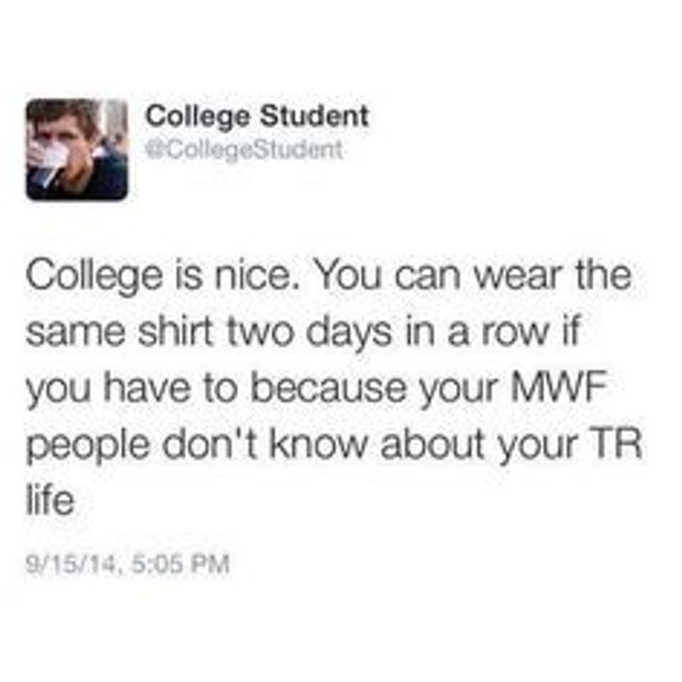 Congratulations to everyone who is a true freshman; you've now made it to week whatever-this-is and can truly be considered a college student. Not that you weren't a college student before, but at this point you've crossed the bridge from living a high school lifestyle to truly living life as a college student (too late to turn back now). Just in case you're wondering if you now fall on the student spectrum in the college category, here's a list of all the things that you'll now probably notice that you're doing.