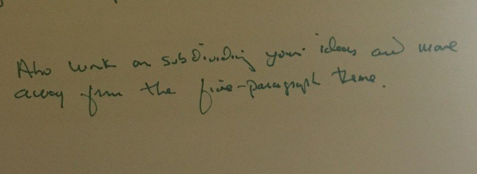 I know this may seem a little surprising because most of us were conditioned and trained to stick to this five paragraph essay style throughout high school, but most professors are looking for unique ways of formatting a paper, especially when you are defending an argument. Don't believe me? Here's a picture of a comment one of my professors wrote on one of my papers. (I still did get a 92 percent on this paper simply because I'm awesome).
