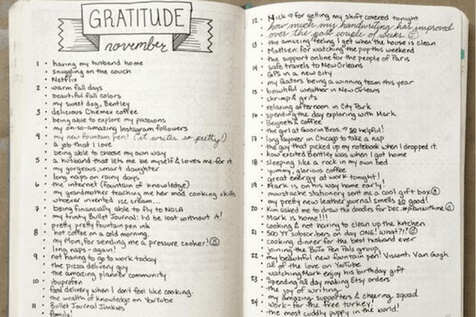 Tips: Keep a gratitude journal. Pray. Be spiritual, whatever that means to you. Smile, say thank you, send "thinking of you" cards. Use your senses to appreciate life's incredible gifts. Forgive. Practice being less materialistic.