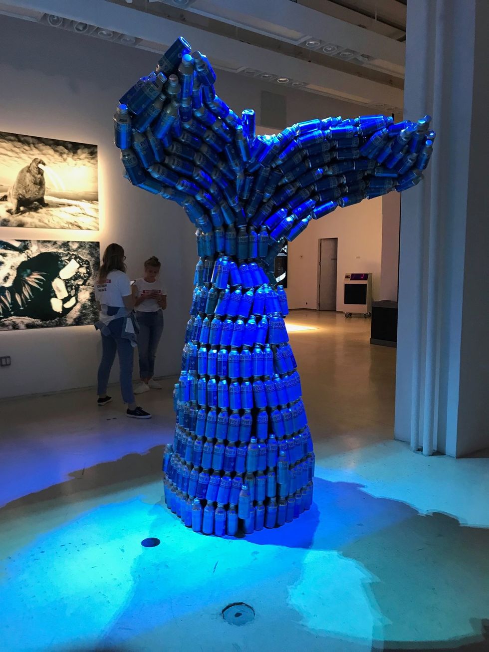 The energy it takes to take a crumbled piece of paper or a sprite can and put it in the correct bin is virtually nonexistent. If there is no said container in the building or facility, just put it in your bag until you reach home, or so you can make a bigger difference, make a request to someone who works there that there be one. Recycling and using recyclable materials stops pollution and lessens the size of landfills. Also to reinvent is to create a project (like the art exhibit pictured above) that uses something most people deem as garbage and create something beautiful or inspirational.