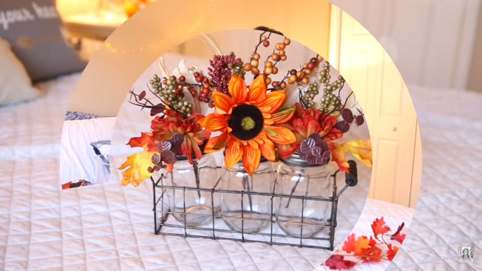 This flower display is as easy as it gets. You can get all of the items from your local dollar store. All you need are jars and fake flowers (fall colors of course).