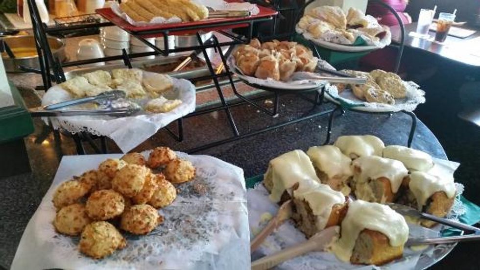 7. Kelly’s salad bar, cheese soup, and cinnamon rolls.