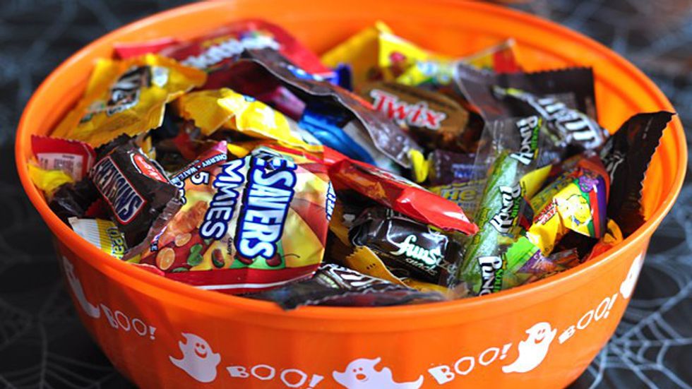 Next time you're out grocery shopping, pick up some of your favorite candy and even some of your roommate's favorite candy if you're feeling nice! Then put it in a Halloween themed bowl and you're good to go.