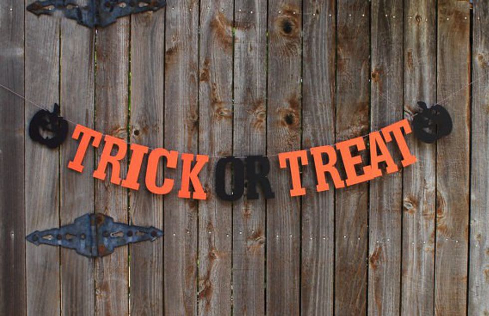 This is one you could definitely DIY. Pick out your favorite Halloween saying, like "Happy Halloween" or "Trick or Treat". Then you can cut out these letters on some cardboard paper in shapes, like triangles. Then connect them with a string and hang them up!
