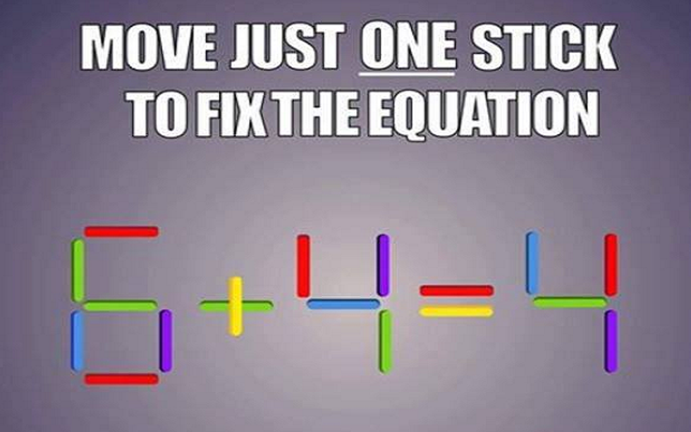 7. Move the blue stick from the number "6" and place it horizontally on the top of the second "4" to make it "9," OR move the yellow stick from the plus sign and move it to the "6" to make it "8."