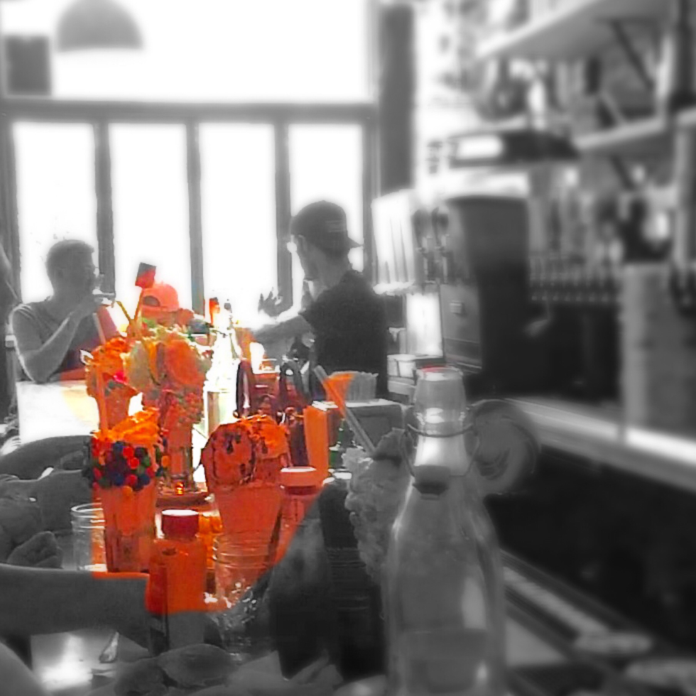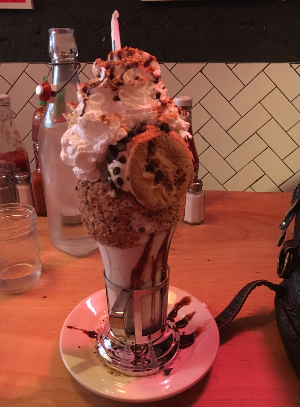 Okay my Instagram has several unnecessary pictures of this place, so? The reason for this small place's recent rise to fame is actually not for its burgers. Its milkshakes are literally the most beautiful desserts in the world. How would I know? Because I've been here, and now I can finally say that. The original location is in Soho, on Broome Street. It's a tiny little pub along just a regular street with a small market next door. Here's the funny thing: the wait time has gotten so long before that they had to place line ropes outside of Black Tap then another set all the way down on the corner of the street. I waited in the rain, but only for a half an hour. I'm not even being sarcastic; that wait time was nothing compared to what others went through last winter, when the wait time ranged from 2 to 7 hours! Their shakes include the Cotton Candy shake, the Cookie shake, the Brooklyn Blackout, which is a shake with a huge brownie on top and lots of chocolate, the Reese' Pieces shake. and a bunch more especially on holidays now. They plaster vanilla icing on the sides of a glass, cover that in either cookie crumbs, reese's pieces, candy, or brownie, then pour the shake in, attach brownies, cookie sandwiches, cotton candy fluff, or other things around and on top of a huge mountain of whipped cream. /yes, there's plain milkshakes and delicious burgers and other actual food, but when you come here, you come to live, not be boring.